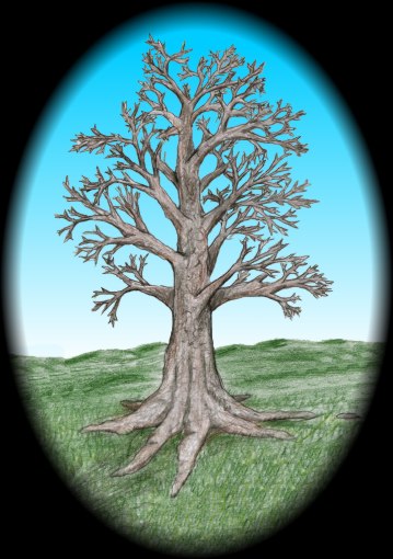 a grassy valley. The only other object in this valley is an ancient tree.